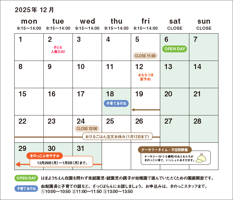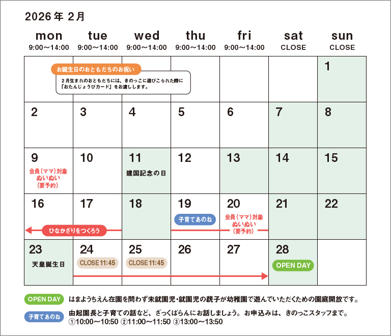 原則的に月曜日~金曜日の毎日オープンしていますが、幼稚園の行事などによって変わることがありますので正確な開館日時は『今月のきのっこ』をご覧になるか、園までお問い合わせください。 ★開場日 月~金曜日の毎日 ★開場時間 午前9時15分~午後2時 ★休場日 土日祝・お盆・年末年始・年度末など |