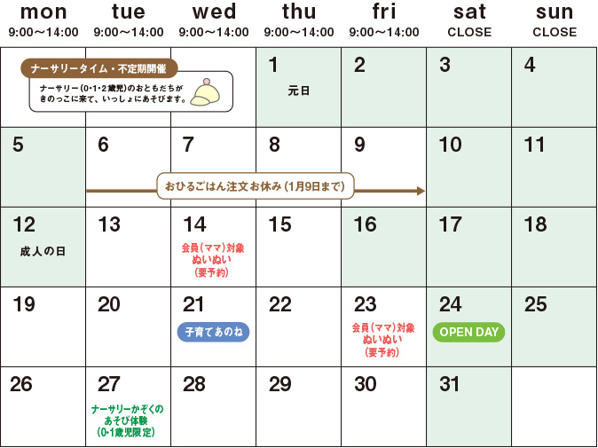 原則的に月曜日~金曜日の毎日オープンしていますが、幼稚園の行事などによって変わることがありますので正確な開館日時は『今月のきのっこ』をご覧になるか、園までお問い合わせください。 ★開場日 月~金曜日の毎日 ★開場時間 午前9時15分~午後2時 ★休場日 土日祝・お盆・年末年始・年度末など |