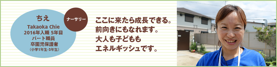 | 新卒で働きはじめて、結婚して、出産を3回しました。 はまよう以外の保育施設では働いたことはないです。 はまようでは、働き方を4つの中から選べるのですが ずっとフルで働いていましたが、第一子が生まれてからは「時短」で働いています。 |