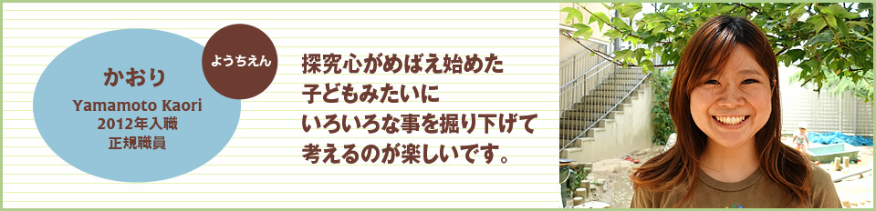 | 私は、深く考えることが苦手やったんですが、 遊んでる子どもたちと同じで「これってどうなってるんかな?」と 探究心がめばえた子どもみたいに掘り下げていくのが楽しいです。 気がつけば自分のことも周りのことも、今まで関心のなかったことも たくさん考えるようになっていました。 |